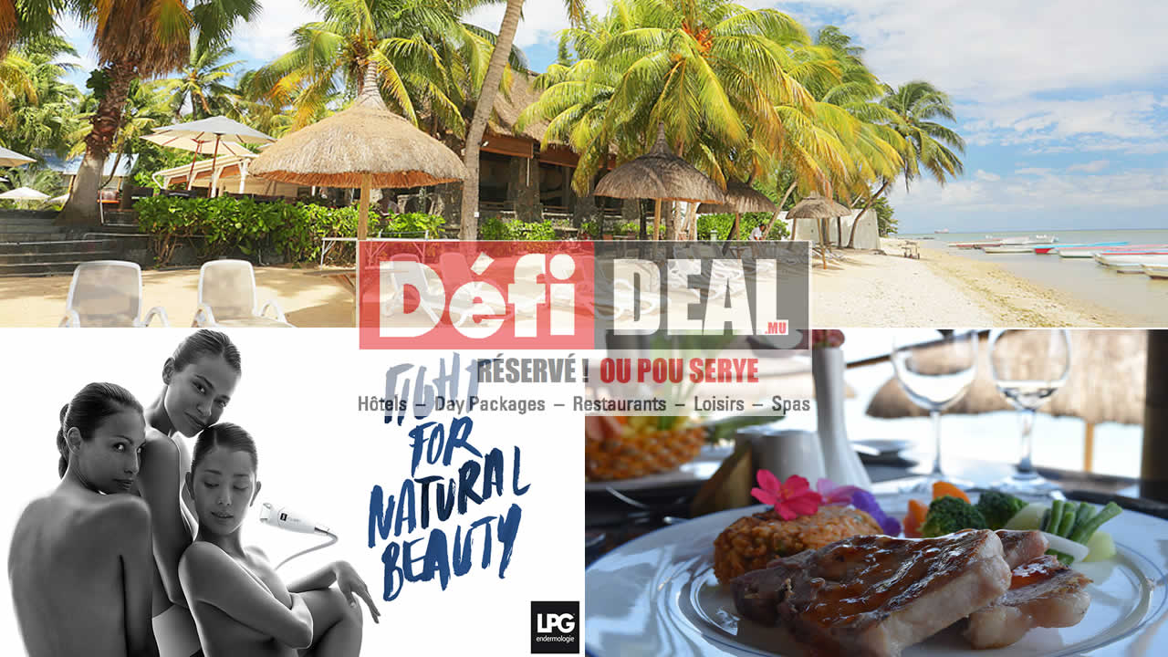 Défideal, une plateforme de réservation en ligne, permet aux Mauriciens et aux résidents de bénéficier d’offres exceptionnelles sur diverses prestations dont, notamment, des hôtels, des activités terrestres et aquatiques, des soins de bien-être et de beauté et des restaurants. Pour en profiter, il suffit de se connecter au www.defideal.mu ou d’appeler au 210 53 00 pour de plus amples renseignements. Cette semaine, découvrez :