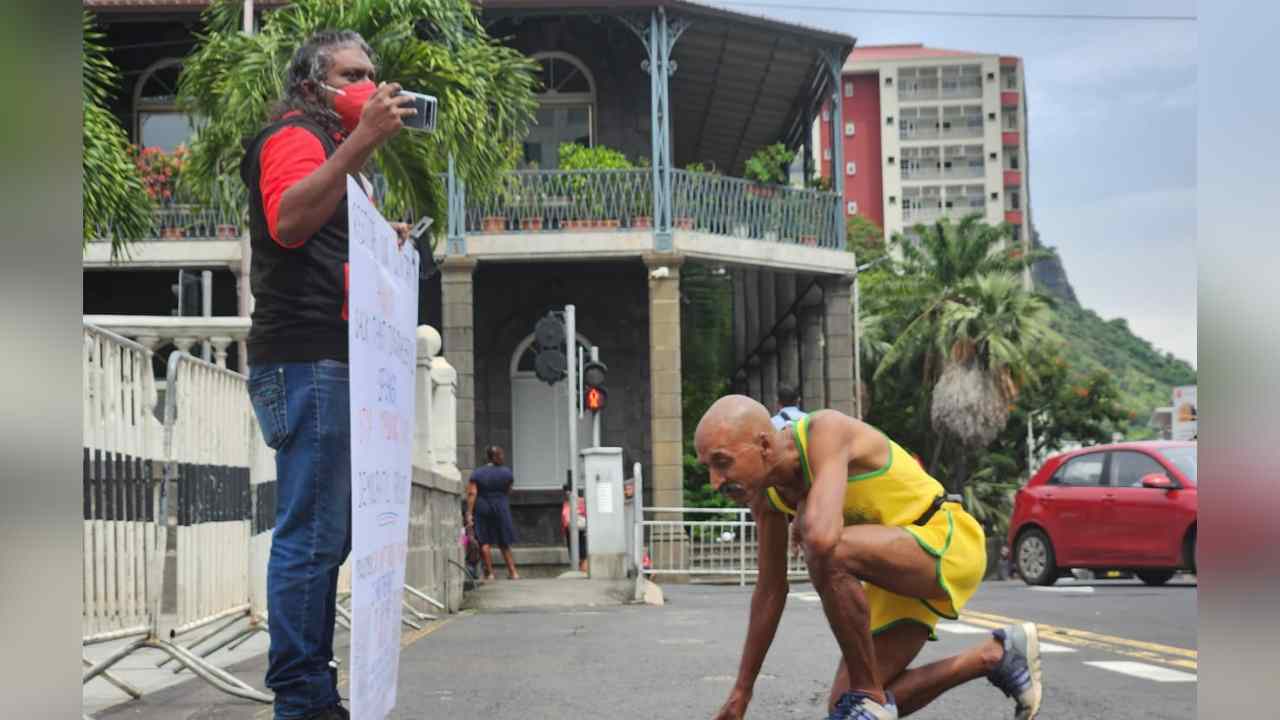 Une scène qui a capturé l'attention de notre photographe ce matin de mardi. Voyez plutôt : un homme s'agenouille devant une pancarte brandie par Reuben Pillay, en face de l'Hôtel du Gouvernement. Sur la photo, on dirait qu'il étudie attentivement ce qui est écrit sur la pancarte.