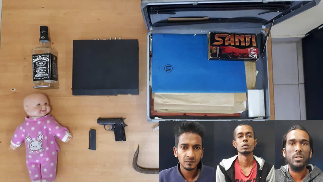 Les voleurs ont jeté une partie des articles volés dans un terrain abandonné à Coromandel. Le revolver et les bouteilles de boissons alcoolisées ont été retrouvés à Chebel chez les frères Seedoyal. L’arme était cachée dans une poupée.